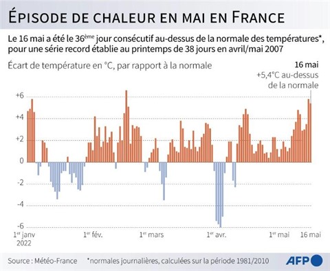 Tous les jours depuis le 11 avril et jusqu'à mardi, les températures en France ont été au-dessus de la normale. Quand la moyenne de mercredi 18 mai sera confirmée, cette période de 38 jours consécutifs au-dessus de la normale devrait être un record de durée, le précédent datant d'il y a seulement deux ans. La "normale" est la période de référence 1981-2010. Même en Bretagne, l'île de Bréhat a égalé cette semaine son record datant du 31 mai 1992, avec 27,8°C.