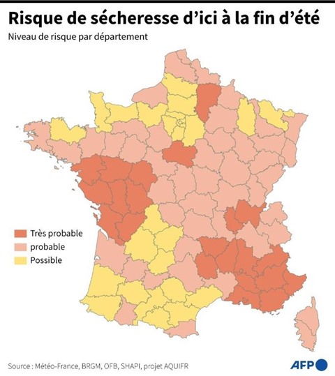 "On a un mois de mai non seulement très chaud, mais très sec. De la frontière belge à l'Atlantique, on a un déficit pluviométrique de 20 à 30%", dit Olivier Proust, prévisionniste à Météo-France. Le gouvernement a publié mercredi 18 mai sa carte des risques de sécheresse, et pas moins de 22 départements y apparaissent en rouge, c'est-à-dire avec un risque "très probable" d'ici à la fin de l'été, principalement dans le Sud-Est et l'Ouest du pays.