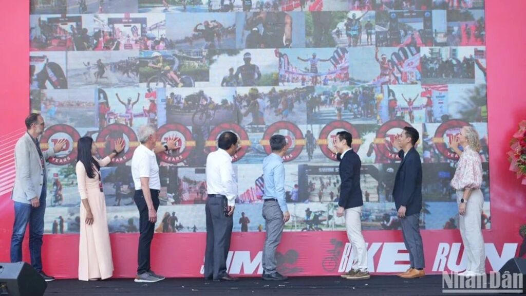 | Le comité d'organisation appuie sur le bouton d'ouverture d'événement sportif phare IRONMAN 70.3 Dà Nang 2025. |