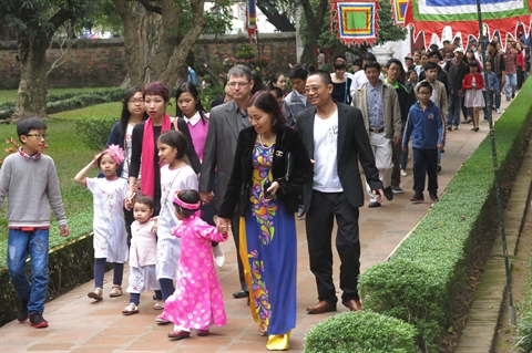 | Des touristes au Temple de la Littérature de Hanoi. |