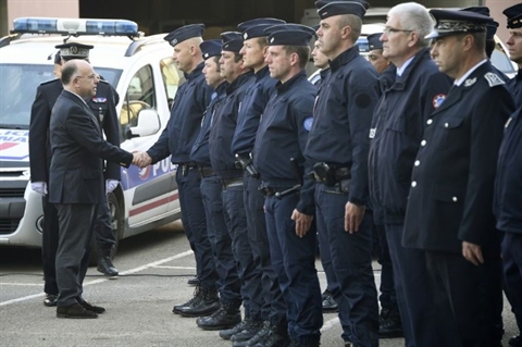 | Bernard Cazeneuve (gauche) avec les forces de l'ordre le 15 mai à Rennes. |