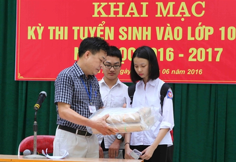 | Des élèves et un surveillant contrôlent le sujet de littérature qui doit avoir été scellés dans un sac plastique au lycée Nguyên Gia Thiêu de Hanoi. Photo : Quy Trung/VNA/CVN |