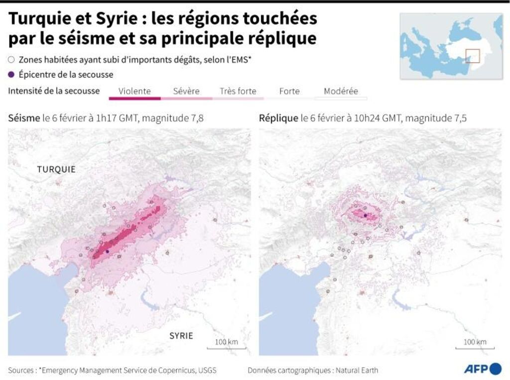 | Carte de la région frontalière entre la Turquie et la Syrie, localisant les zones les plus touchées par le séisme de magnitude 7,8 et par sa réplique survenue le 6 février. |
