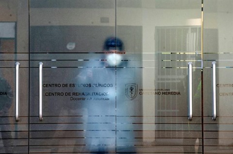 | Un membre du personnel médical dans un centre de recherche de l'université Cayetano Heredia de Lima le 9 septembre |
