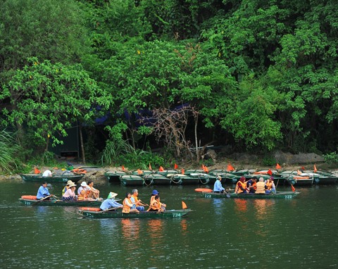 | Touristes découvrant le complexe paysager de Tràng An, province de Ninh Binh (Nord). |