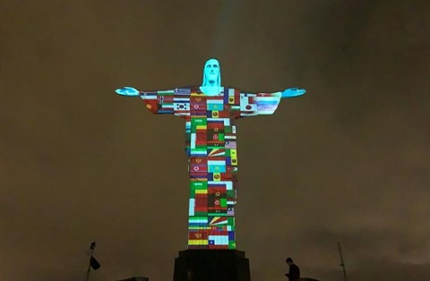 | Projection des drapeaux de tous les pays infectés par le coronavirus, sur le Christ rédempteur de Rio de Janeiro, le 18 mars. |