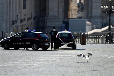 | Des policiers italiens, le visage couvert par un masque, près de la place St-Pierre à Rome, le 19 mars. |