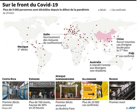 En Espagne, qui déplore 767 morts, les autorités se préparent "au plus dur". Plus aucune partie du monde n'est épargnée : le nouveau coronavirus a fait un premier mort en Afrique subsaharienne, au Burkina Faso en Russie, et un premier cas au Fidji et au Niger.
