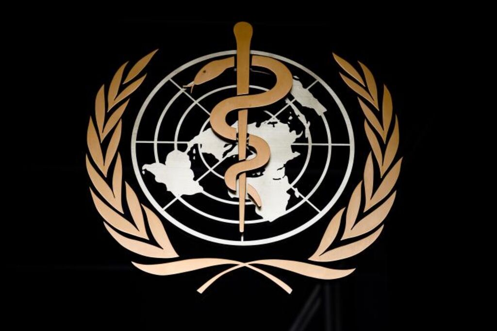 | Logo de l'Organisation mondiale de la santé à l'entrée de son siège à Genève. |