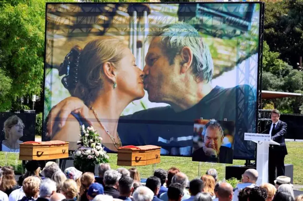 Sur des versions actuelles de chants traditionnels interprétées par le groupe niçois Nux Vomica, dont un vibrant "Bella Ciao", les deux cercueils recouverts chacun d'un drapeau occitan ont été déposés côte à côte devant une grande photo du couple s'embrassant.