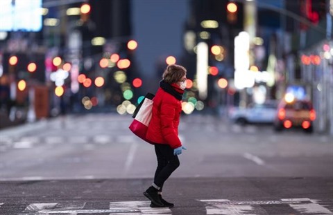 | Une femme masquée contre le coronavirus traverse un Times Square quasi-désert le 23 avril, à New York. |