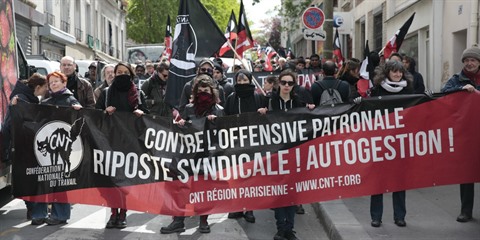 Les manifestants venus vers midi en nombre sur la place des Fêtes, dans le XIXe arrondissement (Nord-Est), ont déployé des banderoles "Contre l'offensive patronale, riposte syndicale! Autogestion !" de la Confédération nationale du travail (CNT) et "Front social/Contre le fascisme, l'État et le capital" d'Alternative libertaire.