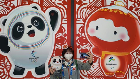 | Une bénévole prend un selfie au Village olympique des Jeux olympiques d'hiver de Pékin 2022 dans l'arrondissement de Yanqing dans la capitale chinoise, le 31 janvier. |