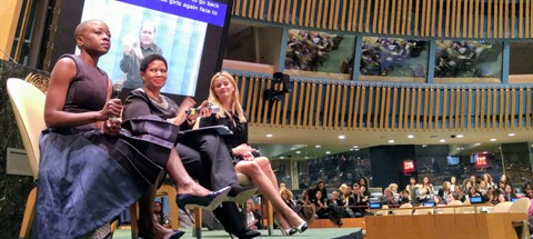 | Phumzile Mlambo-Ngcuka (centre), directrice exécutive d'ONU Femmes, lors de la célébration de la Journée internationale des femmes (8 mars) au siège de l'ONU. |