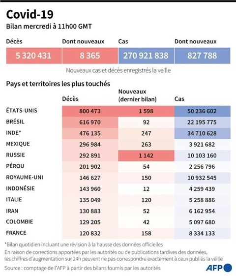 La pandémie a fait au moins 5 .319. 316 morts dans le monde depuis fin 2019, selon un bilan établi par l'AFP à partir de sources officielles mercredi en milieu de journée.