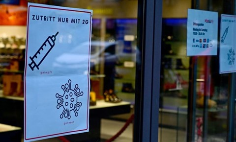 | Une affiche à l'entrée d'un magasin indique que seules les personnes vaccinées ou guéries du COVID-19 sont autorisées à entrer, le 13 décembre à Berlin. |