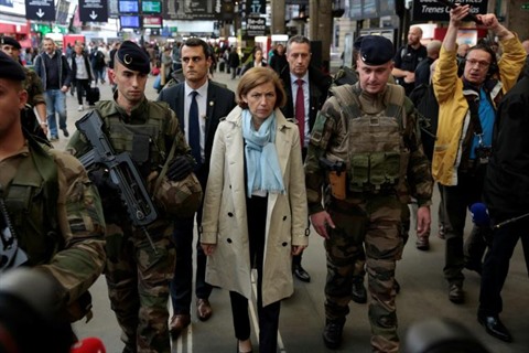 | La ministre des Armées, Florence Parly, entourée de membres de l'opération Sentinelle à la gare Montparnasse à Paris, le 2 octobre. |