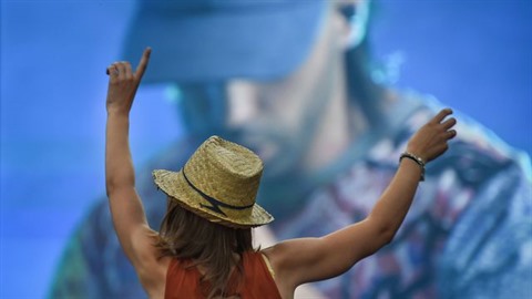 | Des festivaliers font la fête devant "PNL" aux Eurockéennes de Belfort, le 6 juillet 2017. |