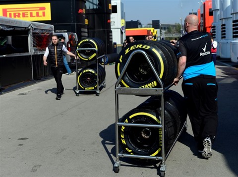 | Pneus Pirelli pour la nouvelle saison de F1, sur le circuit de Catalogne, à Montmelo, le 21 février. |