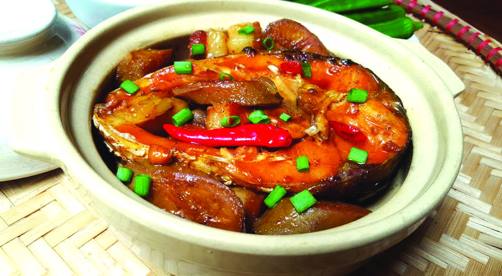 - Dans une cocotte, disposez au fond les tranches de galanga, l’échalote, les piments, une couche de porc et de banane, puis ajoutez le poisson. Terminez par une autre couche de banane et de porc.