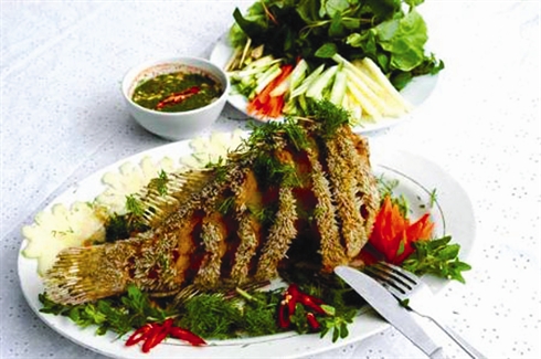 Vider le poisson, retirer les branchies et faire macérer dans de l’eau mélangée avec du sel pendant un quart d’heure. Laisser égoutter. Strier ensuite jusqu’à l’arête dorsale les flancs du poisson. Lorsque l’huile est bien chaude, placer le poisson dans la poêle - à feu doux pour ne pas précipiter la cuisson. Une fois cuit (belle couleur jaune et peau à l’aspect croustillant), le disposer sur une assiette que l’on arrange avec fruits et légumes.