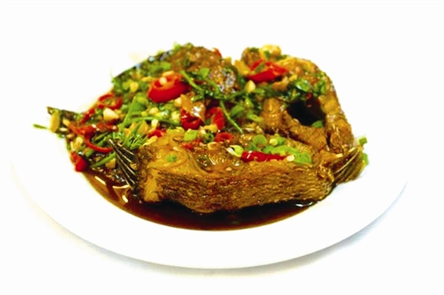 Cette préparation de poisson tête de serpent strié cuit à petit feu dans de la saumure au poivre est servie chaude, accompagnée de riz ou de légumes.