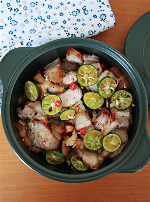 - Laisser refroidir la viande. La couper en tranches puis mélanger avec les kumquats, la citronnelle, le sucre et la saumure.