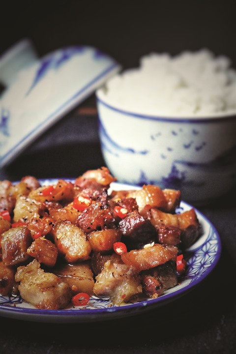 - Nettoyer et couper la poitrine de porc en cubes de 2x2 cm.