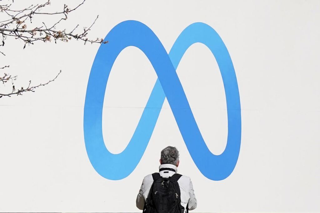 | Une personne se tient devant une enseigne Meta à l'extérieur du siège social de l'entreprise à Menlo Park en Californie (États-Unis), le 7 mars. |