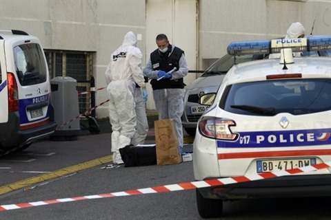 | Des membres de la police scientifique relèvent des indices après une attaque au couteau contre un policier devant le commissariat de Cannes, le 8 novembre. |