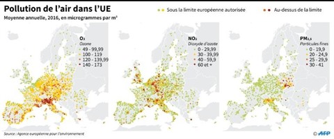 | Carte de la pollution enregistrée aux stations de mesure dans l'Union européenne en 2016, pour les particules fines, l'ozone et le dioxyde d'azote. |