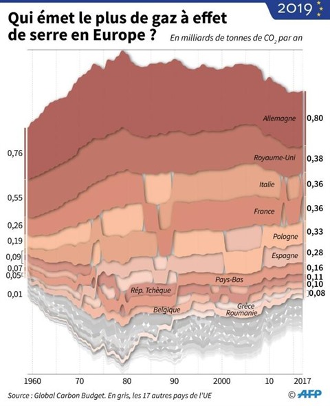 | Classement comparatif des émissions de gaz à effet de serre des pays Européens de 1960 à 2017 selon le Global Carbon Project. |