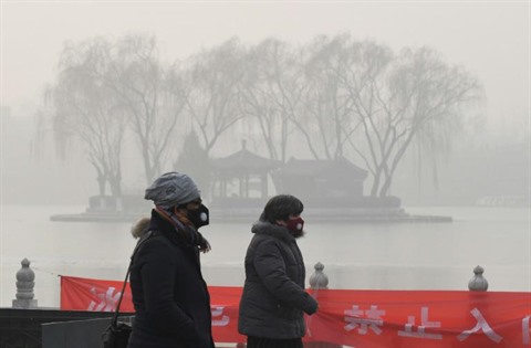 | Des promeneurs marchent le long d'un lac un jour de forte pollution, le 1er janvier à Pékin. |