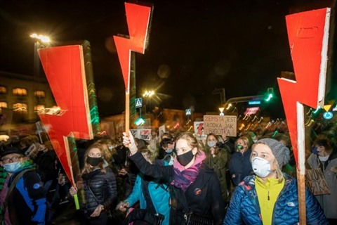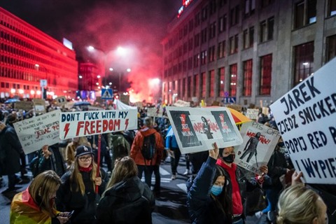 | Manifestation contre l'interdiction quasi totale de l'avortement, le 30 octobre 2020 à Varsovie, en Pologne. |