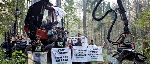 | Des militants de Greenpeace bloquent la coupe d'arbres dans la forêt polonaise de Bialowieza, le 31 août. |
