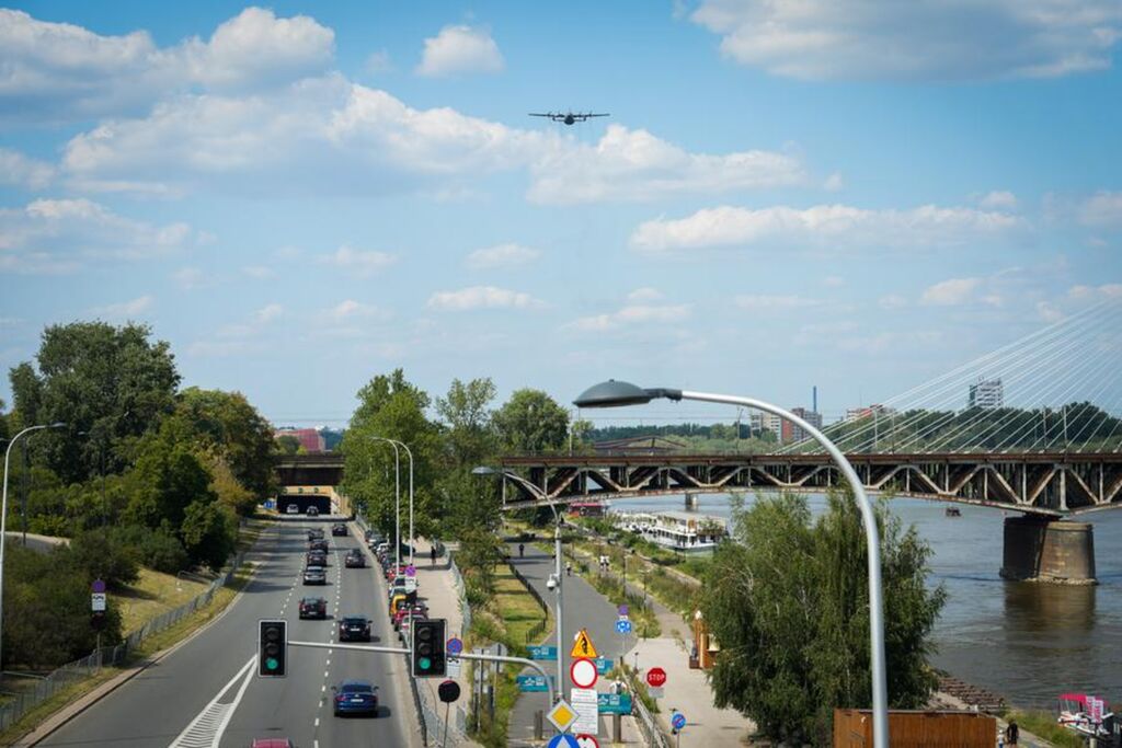| Un avion de transport survole la Vistule lors d'une répétition du défilé de la Journée des forces armées prévu le 15 août à Varsovie, en Pologne, le 9 août 2025. |
