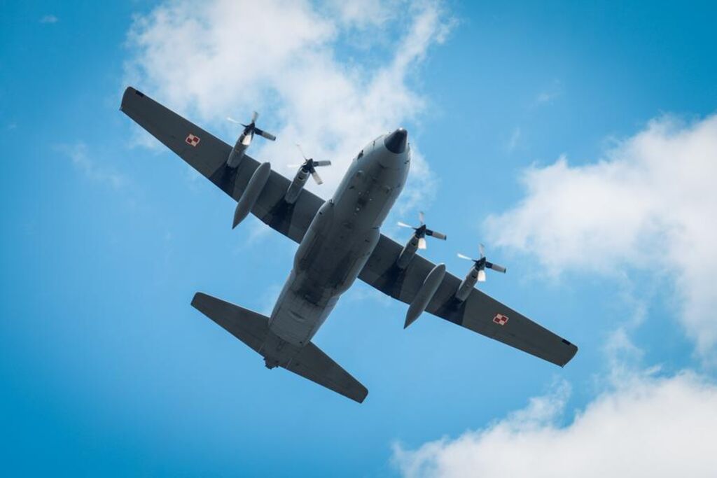 | Un avion de transport est photographié lors d'une répétition du défilé de la Journée des forces armées prévu le 15 août à Varsovie, en Pologne, le 9 août 2025. |