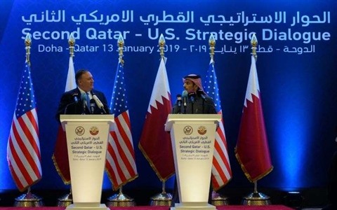 | Le secrétaire d'État américain Mike Pompeo (gauche) et son homologue qatari Cheikh Mohammed ben Abderrahmane Al-Thani, lors d'une conférence de presse conjointe le 13 janvier à Doha. |