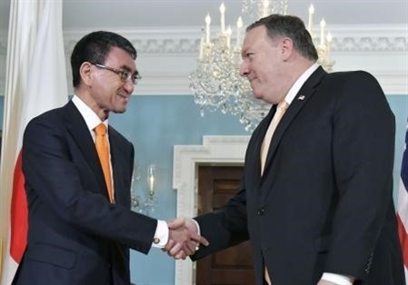 | Le secrétaire d'État américain, Mike Pompeo (droite), et le ministre japonais des Affaires étrangères, Taro Kono. |