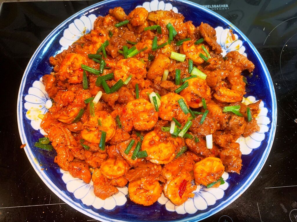 Dans un wok à feu moyen, verser 2 c.à.s d’huile puis verser la citronnelle. Lorsqu’elle est dorée, ajouter la viande et les crevettes et bien mélanger pendant 5 minutes. À feu vif, verser la sauce et mélanger bien. Poursuivre la cuisson sans couvrir et mélanger bien toutes les 5 minutes pour que la viande et crevettes soient enrobés de sauce. Quand la sauce réduit et devient plus épaisse, parsemer le poivre moulu et mélanger bien. Avant de présenter dans l’assiette, parsemer la ciboule fraîche coupée.