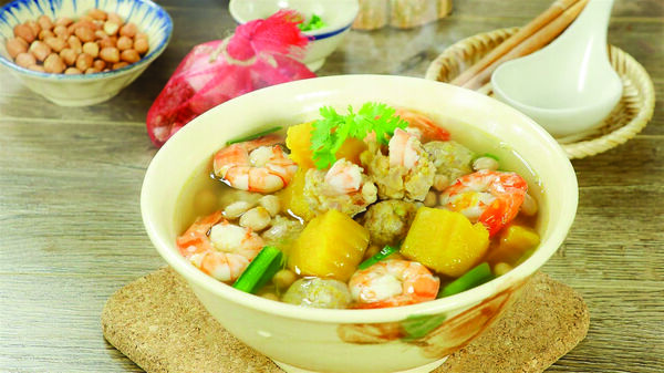 >> Bouillon de citrouille aux crevettes et boulettes de viande