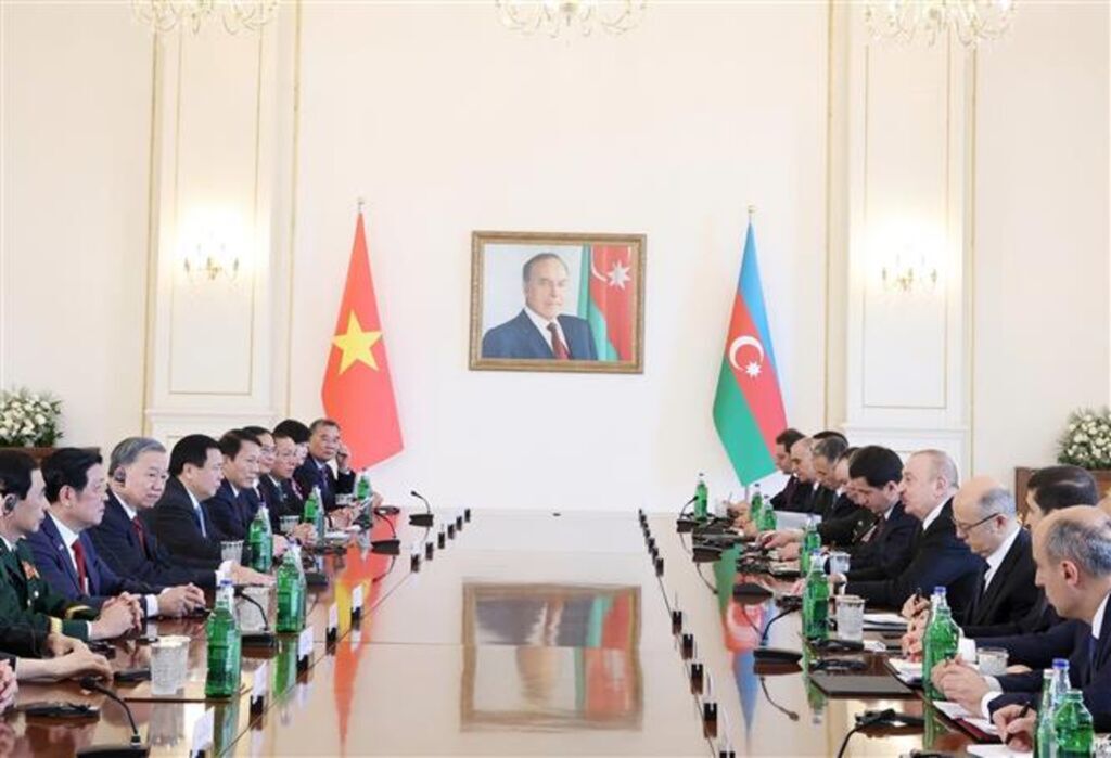 | Entretien entre le secrétaire général du PCV, Tô Lâm (3e à gauche), et le président d’Azerbaïdjan et président du Parti du nouvel Azerbaïdjan au pouvoir, Ilham Aliyev (4e à droite), dans l'après-midi du 7 mai (heure locale) à Bakou. |