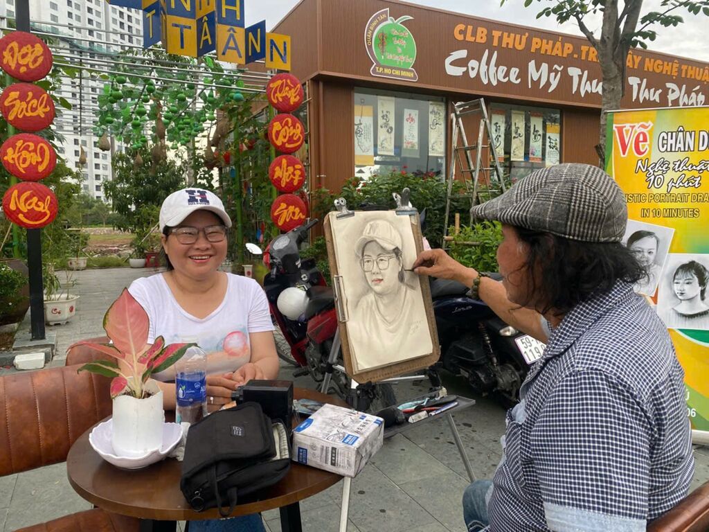 Lê Phu propose principalement ses portraits au fusain les samedis, dimanches et jours fériés. Il affectionne particulièrement le fait de croquer sur le vif les amateurs de lecture ou les flâneurs des kiosques de la rue Nguyên Van Binh, en plein cœur de la ville. Peut-être possédez-vous déjà l’un de ses portraits réalisés dans ce lieu emblématique.