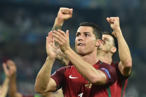 | L'attaquant Cristiano Ronaldo applaudit les supporteurs après la victoire du Portugal face à la Pologne en quarts de finale de l'Euro au Vélodrome, le 30 juin |