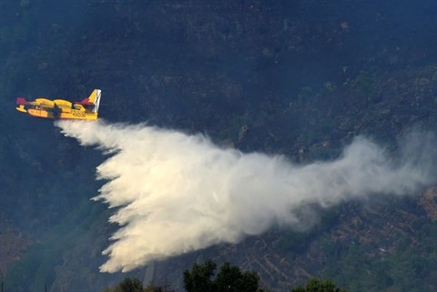 | Un avion canadair déverse sa charge d'eau près du village d'Alijo, lors de feux de forêt, le 18 juillet au Portugal. |