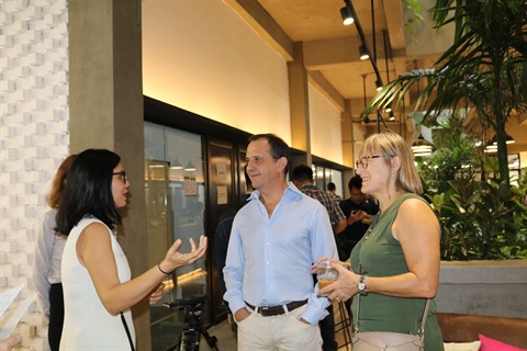 | L’artiste Nguyên Da Quyên (gauche) et le consul général de France à Hô Chi Minh-Ville, Vincent Floreani (centre), lors du vernissage de l’exposition. |
