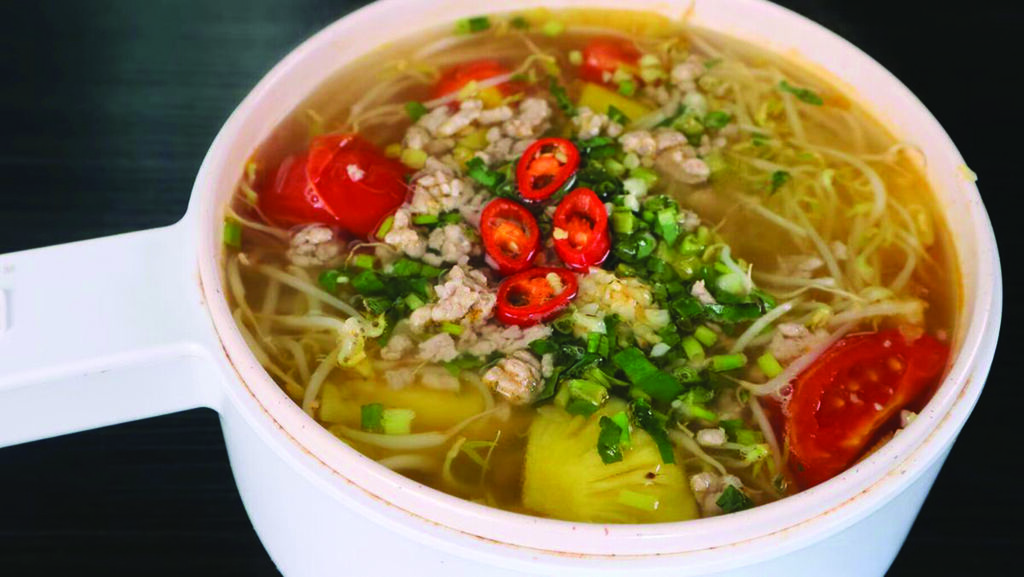 - Un potage équilibré aux saveurs aigres-douces, parfumée à l’ananas, enrichie par la douceur du porc haché et la texture croquante des germes de soja.
