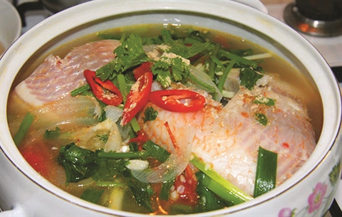- Ajouter dans le fait-tout l’ananas et le poisson. Augmenter le feu jusqu’à ce que le poisson soit cuit. Retirer l’eau de cuisson et réserver le poisson. Mettre les doc mung, dâu bap et faire cuire pendant environ 5 minutes. Ajouter maintenant les germes de haricot. Porter encore à ébullition, puis remettre le poisson dans le fait-tout. Saupoudrer avec les ciboules et les rau ngô déjà coupés en petits morceaux. Éteindre le feu.
