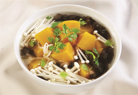- Ajoutez les haricots verts, le poireau, les champignons et le gingembre dans la casserole. Salez puis laissez cuire encore 10 minutes. Disposez le vermicelle de riz au fond des bols, versez le potage et parsemez de menthe et de coriandre.