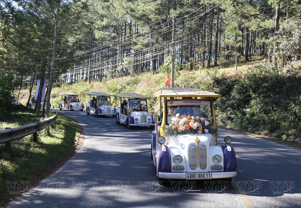 | Des voitures électriques emmènent les visiteurs sur une route bordée de pins à Dà Lat.  |